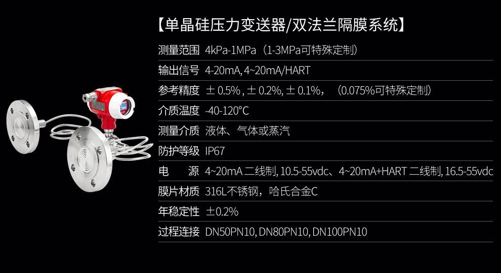 SIN-2051DP雙法蘭差壓液位變送器是一種為避免被測介質(zhì)直接作用于變送器的遠(yuǎn)傳隔離膜片接觸而采用的差壓式變送器(結(jié)構(gòu)測量法)。