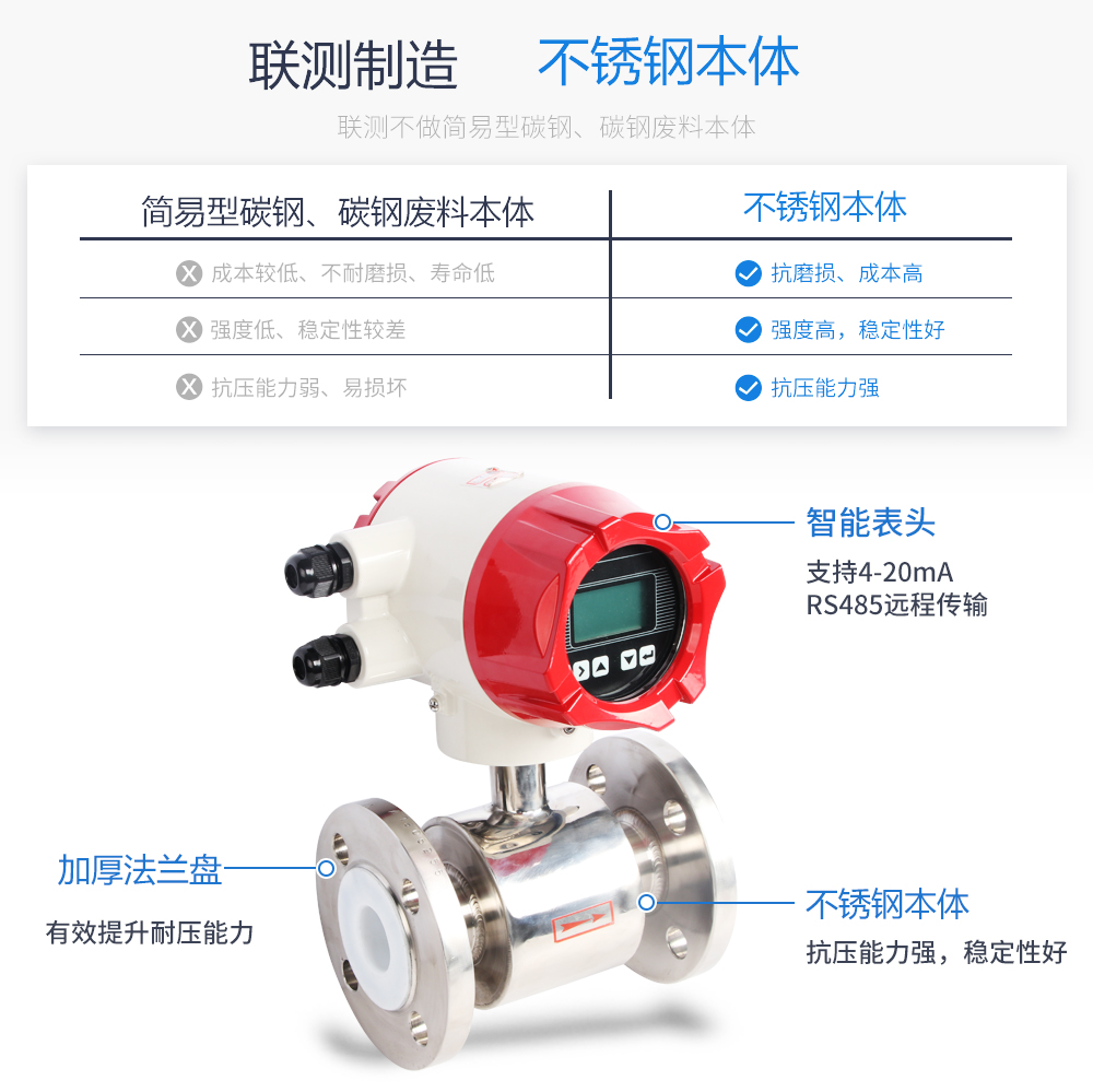 聯測LDG-SIN電磁流量計適用于化工助劑、海綿城市、給水排水、水利灌溉、水處理、污水處理(環保污水控制、化工污水、電鍍污水)、造紙漿液(紙漿)、泥漿、醫藥原料、食品等工農業的生產公司過程流量測量和控制,標配485通訊功能。