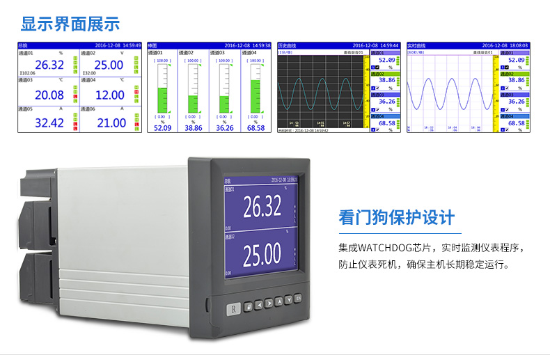 無紙記錄儀是將采集的數據/運算數據以時間為基軸記錄在儀器內部的存儲系統中,無消耗任何常用的記錄設施,如:紙張、筆墨。記錄在儀器內部的存儲數據,通過運算、模擬后顯示在液晶屏。常用顯示用液晶屏比較廣泛。在液晶屏屏幕上,可以顯示數字顯示、棒圖顯示、曲線顯示、報警列表等。無紙記錄儀采集的數據,常用的有:溫度、壓力、流量、液位、電壓、電流、濕度、頻率、振動、轉速等。
