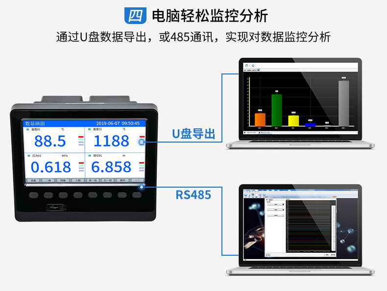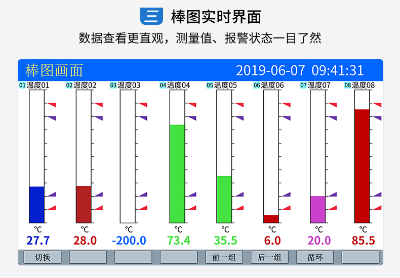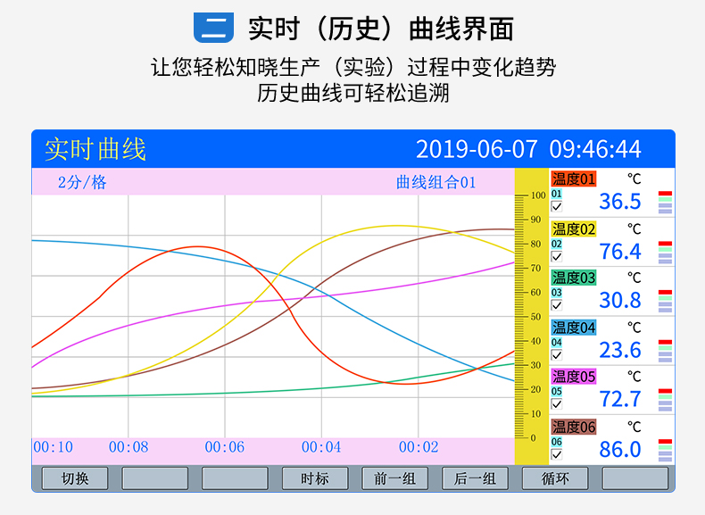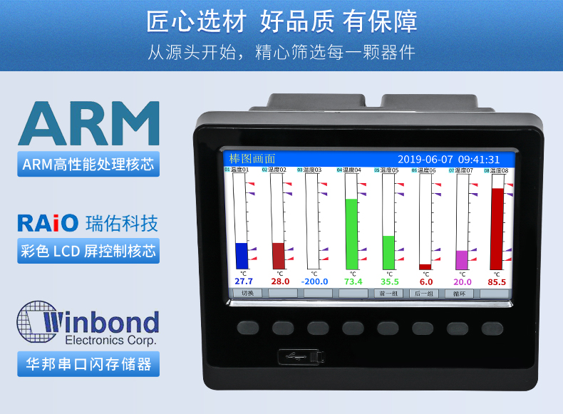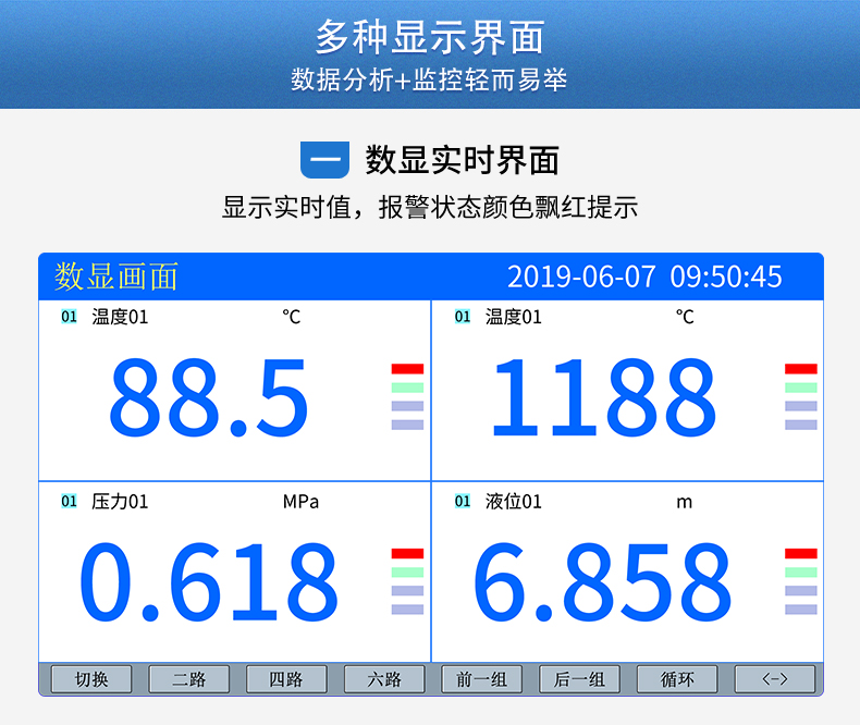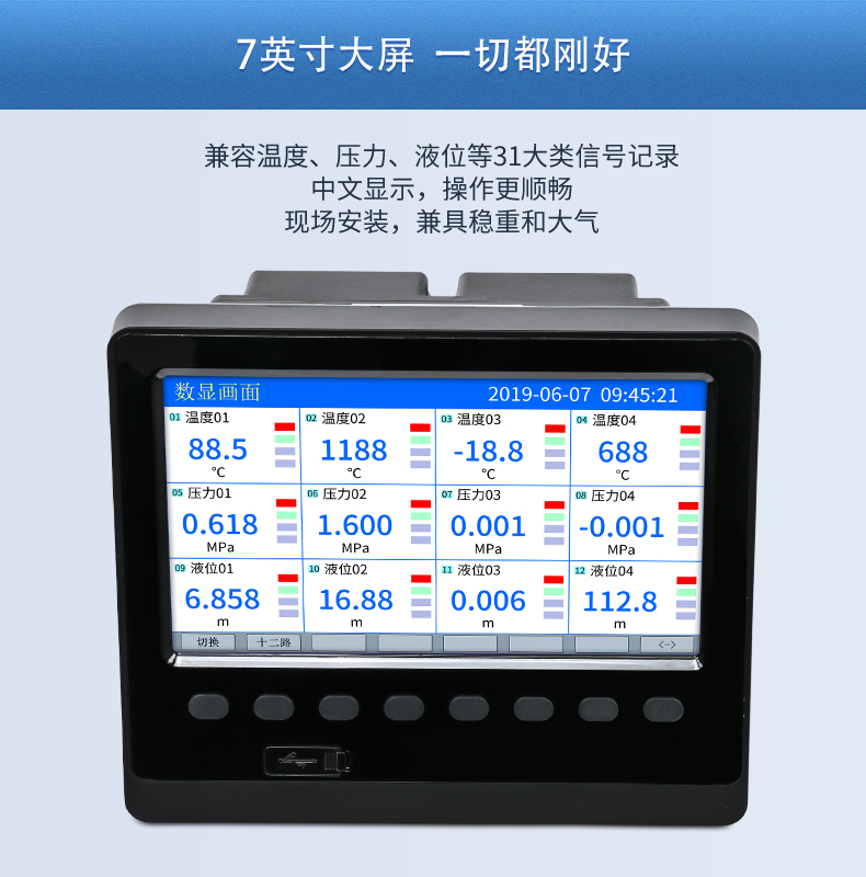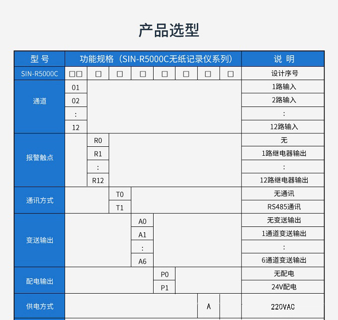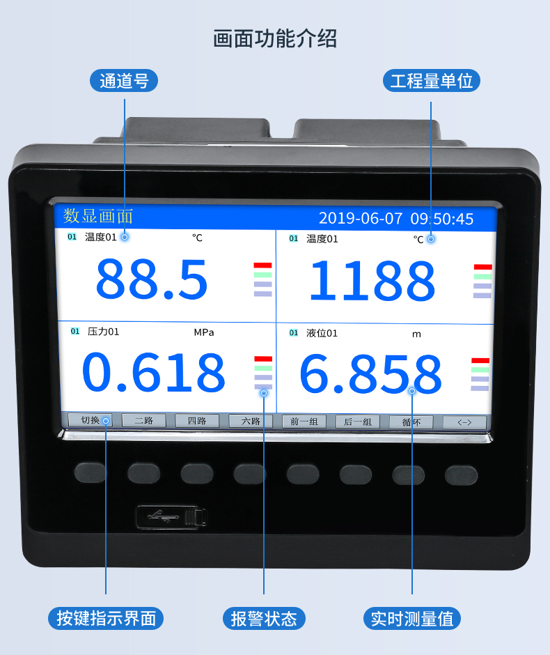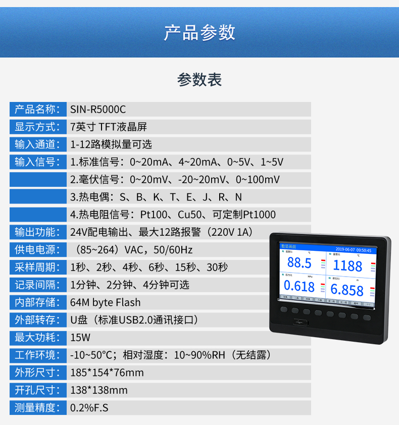 SIN-R5000C無紙記錄儀 12 路萬能輸入(可組態(tài)選擇輸入:標準電壓、標準電流、熱電偶、熱電阻、毫伏等)??蓭?12 路報警輸出或 6 路模擬量變送輸出,RS485 通訊接口,以太網接口,微型打印機接口和 USB 接口,SD 卡插座;可提供傳感器配電;具有強大的顯示功能,實時曲線顯示,歷史曲線追憶,棒圖顯示,報警列表顯示等。人性化的外觀設計、完美的功能體現、可靠的硬件品質、精湛的制造工藝,使儀表具有更高的性能價格比。